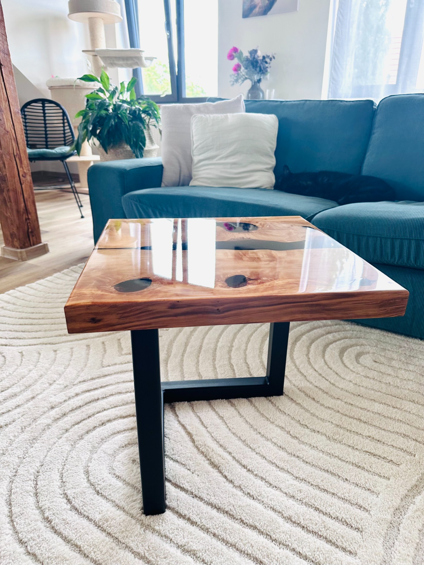Konferenční stůl ze dřeva a epoxidové pryskyřice.